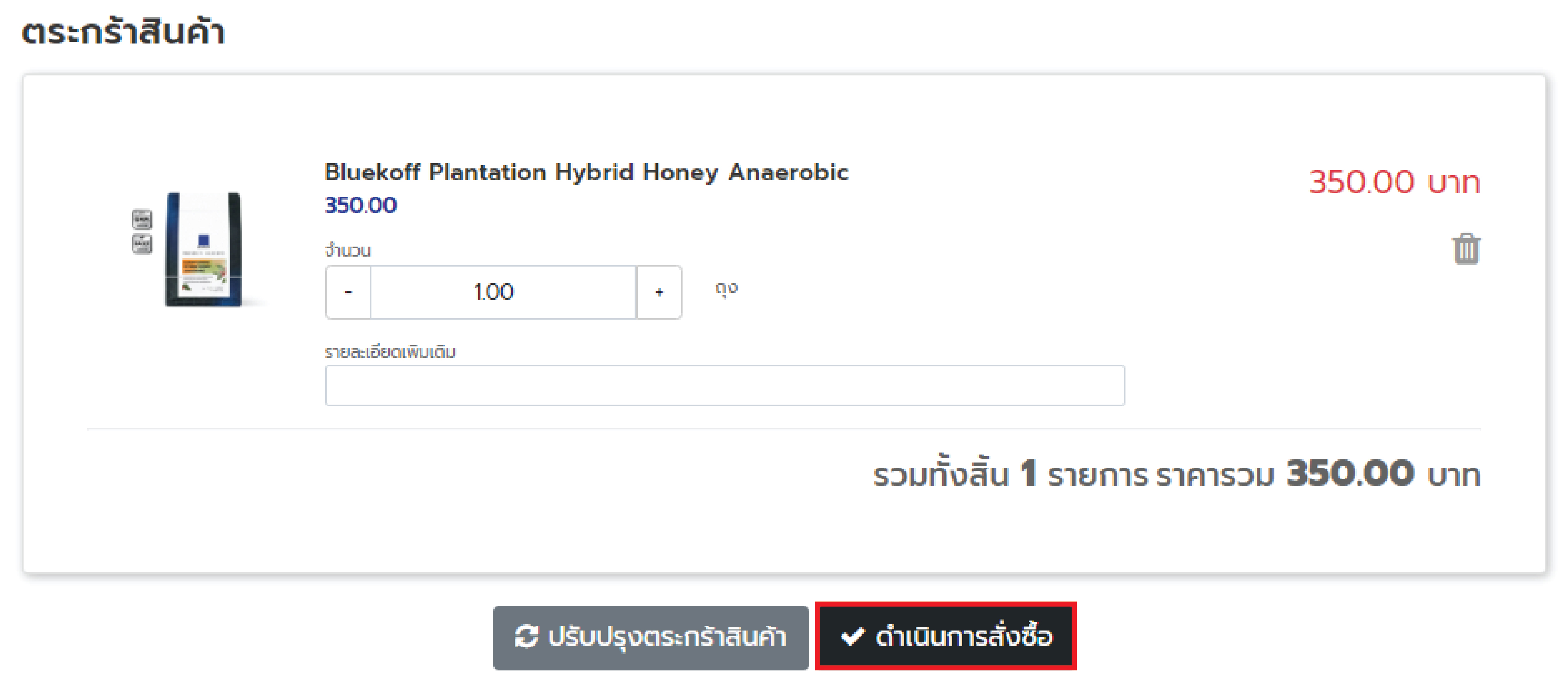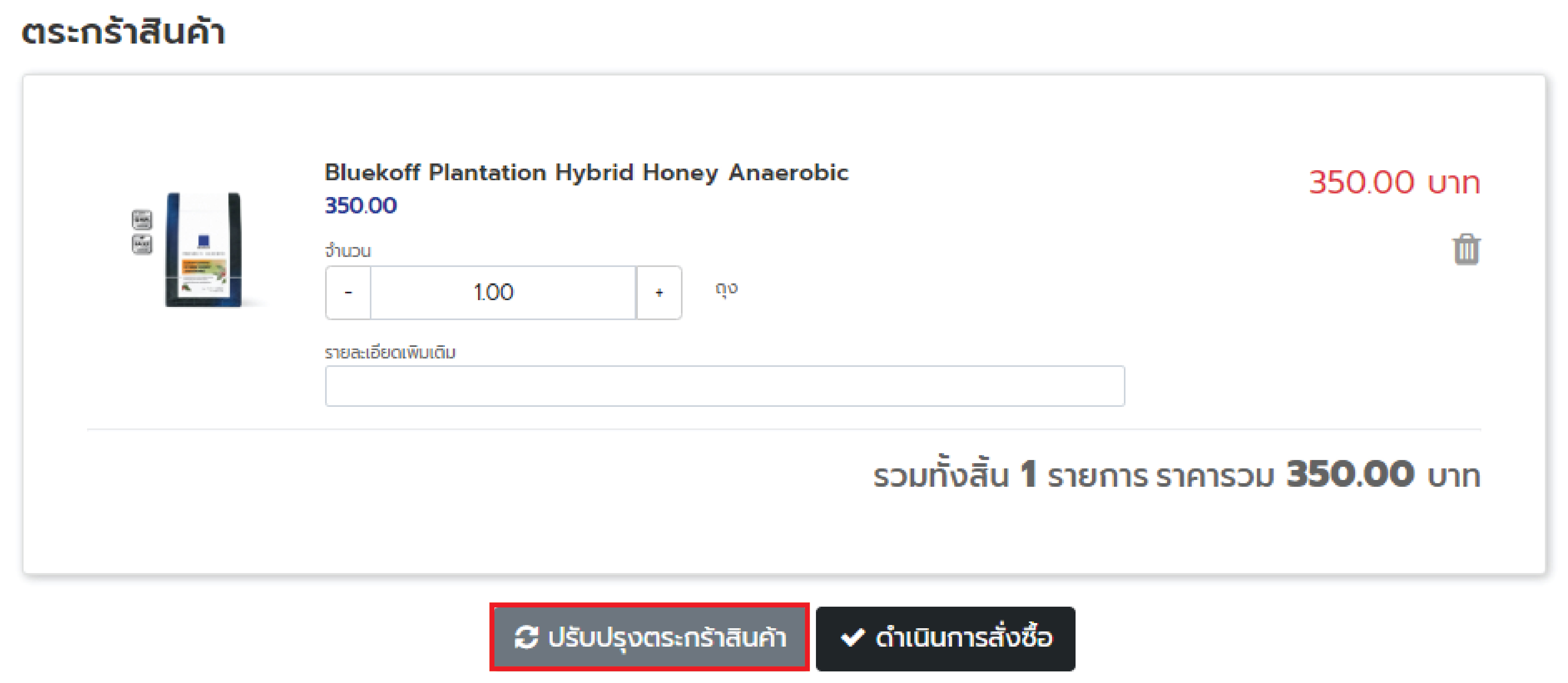 5. ตรวจสอบจำนวนสินค้าที่เลือก สามารถเพิ่มหรือลดสินค้าได้ พร้อมกับใส่หมายเหตุ และกดปุ่มปรับปรุงตะกร้าสินค้า (ตามภาพด้านล่าง)