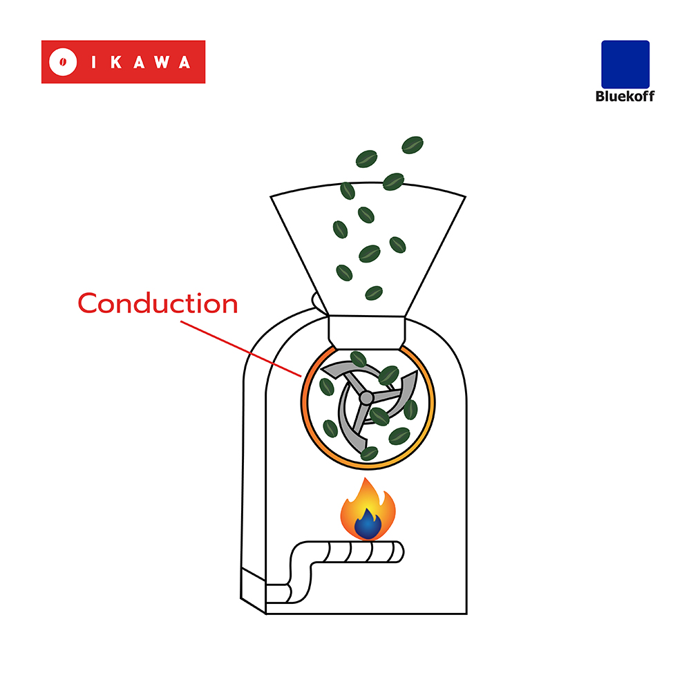 หากกล่าวถึงการนำความร้อนในด้านของการคั่วกาแฟแล้ว คือความร้อนจากถังคั่ว/แผ่นโลหะ/ผนังห้องคั่ว ที่มีความร้อนมากกว่าส่งผ่านมายังเมล็ดกาแฟ เมื่อเมล็ดกกาแฟมาสัมผัสกับบริเวณผนังห้องคั่ว ผู้คั่วสามารถควบคุมได้เพียงช่วงก่อนที่จะใส่เมล็ดกาแฟลงในห้องคั่วเท่านั้น โดยที่ผู้คั่วจะต้องทำการอุ่นเครื่องคั่ว (Pre Heat) ให้มีอุณหภูมิเหมาะสม หากอุณหภูมิขณะวอร์มเครื่องสูงมากจนเกินไป จะทำให้มีพลังงานความร้อนสะสมสูงมาก เมื่อส่งผ่านไปยังเมล็ดกาแฟด้วยความร้อนที่มากเกินไป ส่งผลให้เมล็ดกาแฟไหม้ก่อนสุก หรืออาจจะเกิดจุดไหม้ดำ ที่ผิวของเมล็ดกาแฟได้ หรือที่เราเรียก Chipping นั่นเอง