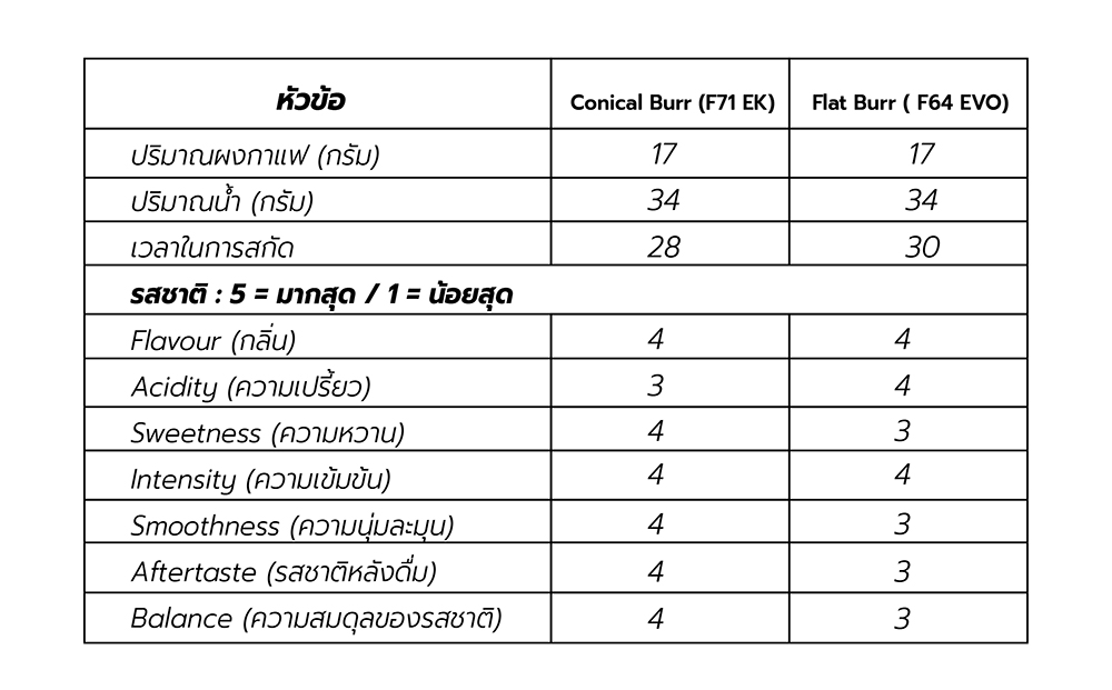 ผลการทดลองจากกลุ่มผู้ทำการทดลองในครั้งนี้ มีแนวโน้มไปในทิศทางเดียวกัน ซึ่งสามารถสรุปได้ว่าถึงแม้ Conical Burr และ Flat Burr จะสกัดรสชาติออกมาได้แตกต่างกันแต่ต้องยอมรับว่า ให้รสชาติที่ดีออกมาที่ใกล้เคียงกันมาก ถ้าให้พูดก็คงจะเป็นความรู้สึกถึงความละมุนที่ต่างกันเท่านั้น แต่สุดท้ายแล้วไม่ว่าจะเลือกแบบไหน ก็ให้มองหารสชาติที่เหมาะสม หรือที่เรียกว่าอร่อยตามแบบฉบับร้านของคุณกันได้เลย!