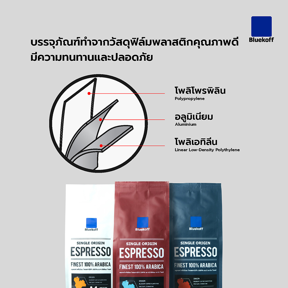บรรจุภัณฑ์สำหรับเก็บกาแฟคั่วควรทำมาจากวัสดุที่มีคุณภาพและมีคุณสมบัติเหมาะสม สำหรับเก็บรักษาและยืดอายุของกลิ่นและคงรสชาติของเมล็ดกาแฟให้นานยิ่งขึ้น บลูคอฟให้ความสำคัญกับจุดนี้เป็นอย่างยิ่ง จึงได้มีการออกแบบบรรจุภัณฑ์ ให้มีคุณภาพเพื่อให้ผู้ดื่มกาแฟได้สัมผัสถึงความสดใหม่ของกาแฟอยู่เสมอ โดยเลือกใช้วัสดุประเภทลามิเนต (Laminate) เป็นบรรจุภัณฑ์ที่เนื้อวัสดุมีฟิล์มพลาสติกตั้งแต่ 2 ชั้นขึ้นไปนำมาประกบกัน ซึ่งฟิล์มแต่ละชั้นจะมีคุณสมบัติที่ดีแตกต่างกัน ทำให้บรรจุภัณฑ์มีความทนทานแข็งแรง สวยงาม และสามารถรักษาคุณภาพของเมล็ดกาแฟได้ยาวนานขึ้น รวมถึงมีความปลอดภัยสูง ไปดูกันว่าในแต่ละชั้นทำจากอะไรและช่วยรักษาคุณภาพของเมล็ดกาแฟได้อย่างไร