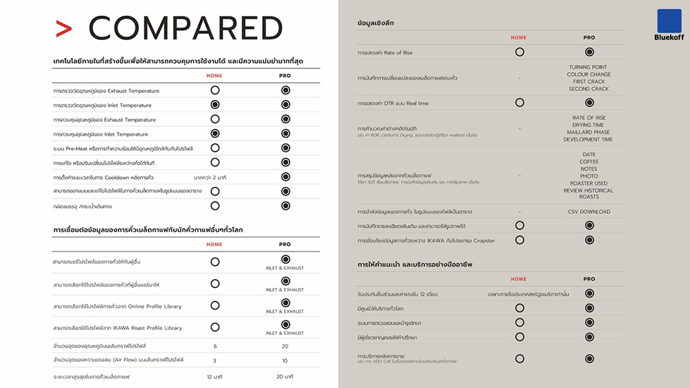 เราจะมาเปรียบเทียบประสิทธิภาพการทำงานของทั้ง 2 รุ่นกันนะคะ ว่าแต่ละรุ่นมีฟังก์ชันและเทคโนโลยีอะไรบ้างที่ทำให้เครื่องคั่วกาแฟ IKAWA มีความแม่นยำสูง สามารถควบคุมการทำงานเพื่อได้ผลลัพธ์ที่ใกล้เคียงกันมากที่สุด