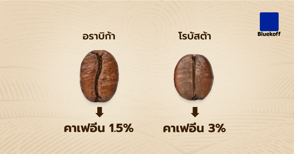 เป็นที่รู้กันดีว่ากาแฟแต่ละสายพันธุ์นั้นมีปริมาณคาเฟอีนที่ต่างกันค่อนข้างชัดเจน จากงานวิจัยที่ถูกเผยแพร่ใน Springer Link ในปี ค.ศ. 2016 ระบุว่า เมล็ดกาแฟดิบ (Green Coffee Bean) ของกาแฟสายพันธุ์อราบิก้า มีสารสกัดคาเฟอีนเฉลี่ย 3.41 – 3.85 กรัมต่อกาแฟ 100 กรัม ส่วนกาแฟสายพันธุ์โรบัสต้า มีสารสกัดคาเฟอีนเฉลี่ย 6.86 – 8.16 กรัมต่อกาแฟ 100 กรัม กล่าวคือ เมล็ดกาแฟสายพันธุ์โรบัสต้ามีปริมาณคาเฟอีนมากกว่าสายพันธุ์อราบิก้า ประมาณ 2 เท่า