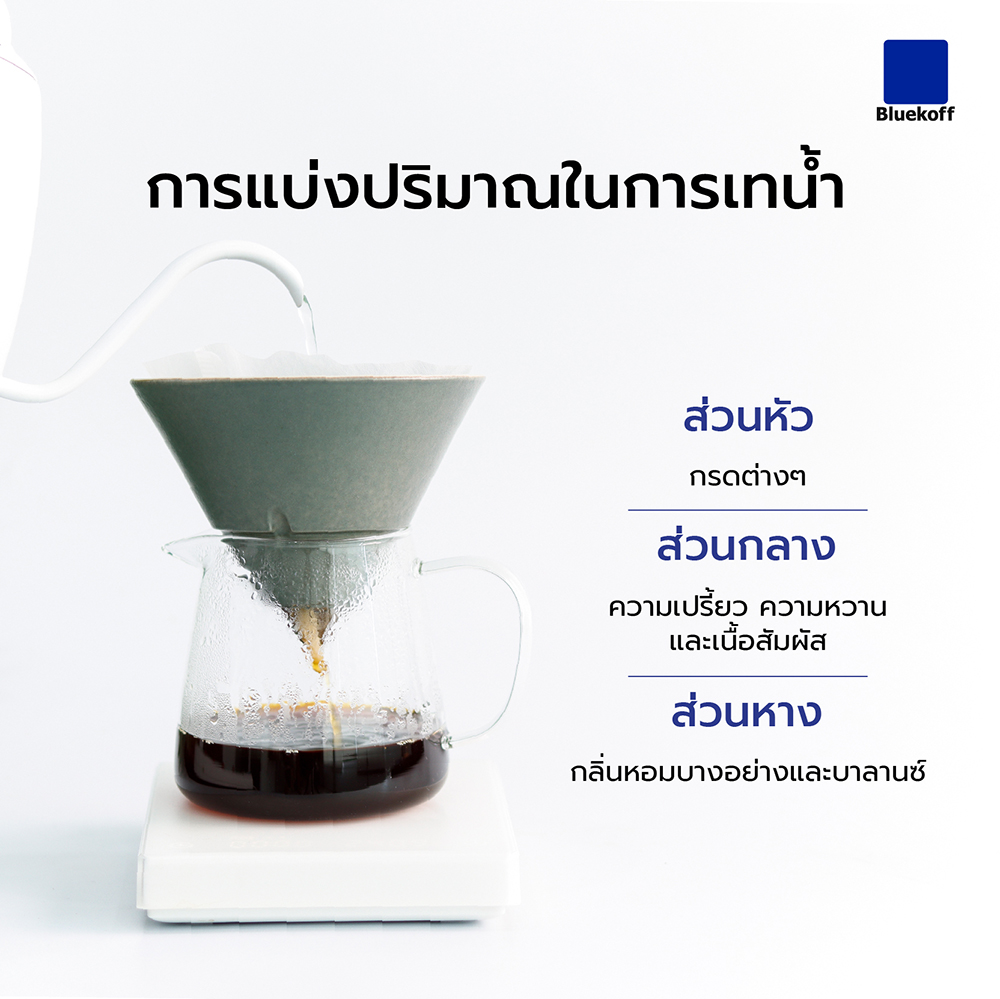 การแบ่งปริมาณน้ำในการเท มีผลต่อรสชาติของกาแฟในแก้ว เนื่องจากสารที่อยู่ในกาแฟนั้นมีหลากหลาย และมีลักษณะไม่เหมือนกัน จึงถูกสกัดออกมาไม่พร้อมกัน เช่น กรดที่ให้รสเปรี้ยวจะมีขนาดโมเลกุลเล็กกว่าน้ำตาล ทำให้ถูกน้ำสกัดออกมาได้เร็วกว่าน้ำตาล เป็นต้น เราสามารถแบ่งให้เห็นภาพง่ายๆ ก็คือส่วนหัว กลาง และหาง คล้ายกับการคั้นน้ำกะทินั่นเอง หรืออาจจะใช้กฎ 40 : 60 ของคุณ Tetsu Kasuya ก็ได้