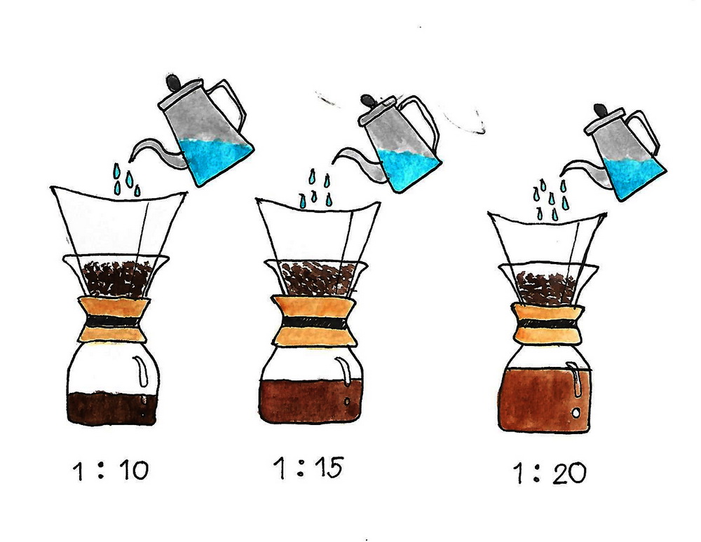 โดยปกติในการชงแบบดริป เราจะใช้ปริมาณผงกาแฟ สำหรับดื่ม 1 – 2 ท่าน อยู่ที่ 15 – 20 กรัม และใช้อัตราส่วนของ ผงกาแฟ ต่อ น้ำที่ใช้ในการชง เป็นตัวกำหนดปริมาณน้ำ (อยู่ระหว่าง 1:10 – 1:20) ขึ้นอยู่กับความเข้มข้นที่ต้องการ ยกตัวอย่างเช่น หากใช้ผงกาแฟ 20 กรัม และใช้น้ำอยู่ที่ 300 กรัม หมายความว่าเราใช้อัตราส่วน 1:15 และถ้าหากชิมแล้วเข้มข้นเกินไป อาจจะเพิ่มปริมาณน้ำที่ใช้ให้เจือจางลง หรือหากต้องการให้เข้มข้นมากขึ้น อาจใช้ปริมาณน้ำที่น้อยลง