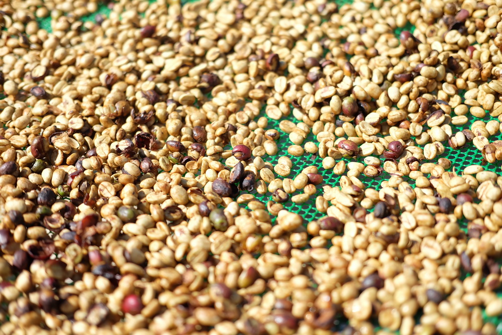 - นำไปตาก โดยตากจนถึงระดับความชื้นที่ต้องการ ซึ่งมาตรฐานทั่วไปจะอยู่ที่ 9 – 12% ระหว่างตากจะต้องเกลี่ยเมล็ดกาแฟอยู่เสมอ เพื่อให้เมล็ดแห้งอย่างทั่วถึงกัน