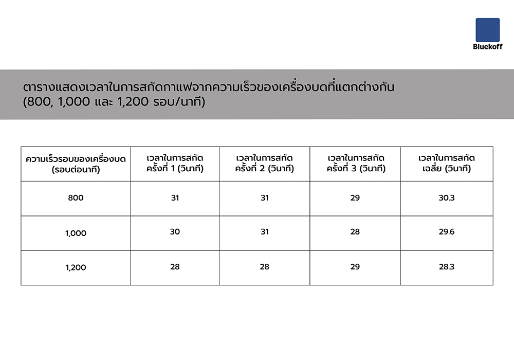 ตารางแสดง เวลาในการสกัดกาแฟ จากความเร็วของเครื่องบดที่แตกต่างกัน (800, 1,000 และ 1,200 รอบ/นาที)