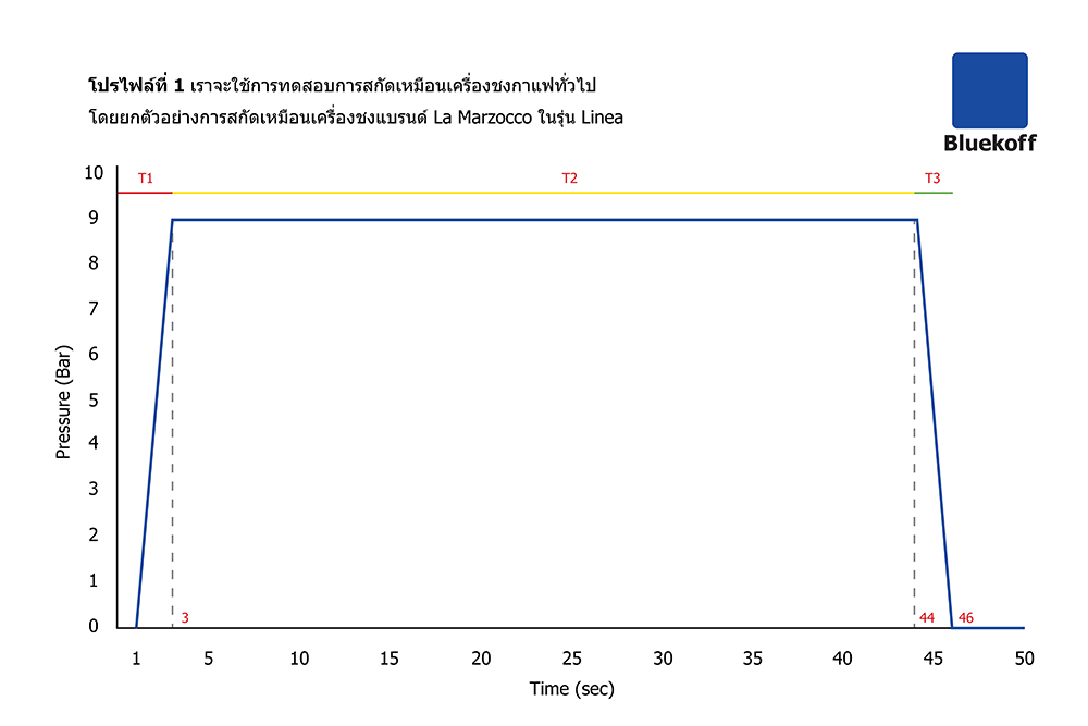 โปรไฟล์ที่ 1 เราจะใช้การทดสอบการสกัดเหมือนเครื่องชงกาแฟทั่วไป โดยยกตัวอย่างการสกัดเหมือนเครื่องชงแบรนด์ La Marzocco ในรุ่น Linea