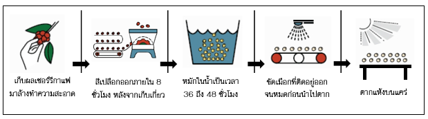 ในกระบวนโปรเซส เริ่มจากการล้างเชอร์รีกาแฟ โดยผลกาแฟจะถูกสีเปลือกภายใน 8 ชั่วโมงหลังการเก็บเกี่ยว เพื่อลดกระบวนการหมักตามธรรมชาติ จากนั้นเมือกกาแฟจะถูกนำไปหมักในน้ำเป็นเวลา 36 ถึง 48 ชั่วโมงในถังหมักขึ้นอยู่กับสภาพอากาศ เมื่อการหมักเสร็จสิ้นกาแฟจะถูกส่งผ่านร่องปูนโดยใช้น้ำและมีเจ้าหน้าที่ทำความสะอาดเมือกที่ติดอยู่จนกว่าเมือกทั้งหมดจะถูกกำจัดออกไปและน้ำที่ไหลผ่านมีสีใส หลังจากล้างเสร็จแล้วนำกะลากาแฟ หรือ Parchment ไปตากแห้งบนแคร่ยกสูงเป็นเวลา 5-7 วัน จนกว่าความชื้นจะลดลงเหลือ 11-12% เพื่อนำไปเก็บในโรงเก็บกาแฟ ก่อนส่งไปยังที่ต่างๆ ทั่วโลก