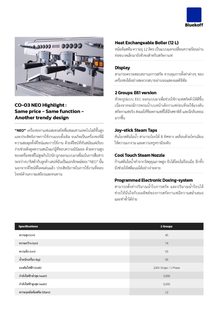 CIME CO-03 2 Gr. NEO E61 เครื่องชงกาแฟเอสเพรสโซที่ผสมผสานเทคโนโลยีขั้นสูงและประสิทธิภาพการใช้งานแบบดั้งเดิม จนเกิดเป็นเครื่องชงที่มีความสมดุลทั้งดีไซน์และการใช้งาน ด้วยดีไซน์ที่ทันสมัยแต่เรียบง่ายช่วยดึงดูดความสนใจแก่ผู้ที่ชอบความมินิมอล ด้วยความสูงของเครื่องชงที่ไม่สูงเกินไปนัก ถูกออกแบบมาเพื่อเน้นการสื่อสารระหว่างบาริสต้ากับลูกค้า เสน่ห์อันเป็นเอกลักษณ์ของ “NEO” นั้น นอกจากดีไซน์ที่โดดเด่นแล้ว ประสิทธิภาพในการใช้งานที่ตอบโจทย์ด้านความเสถียรและทนทาน ถือว่ามีความคุ้มค่ากับราคาไม่เป็นรองใคร