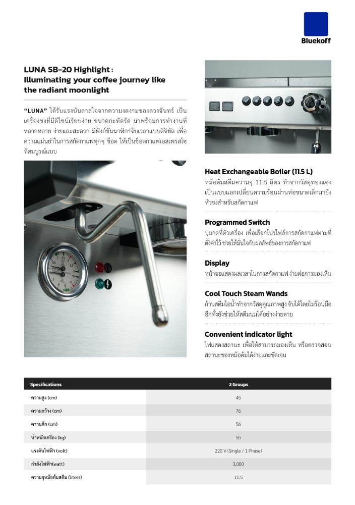 “LUNA” ได้รับแรงบันดาลใจจากความงดงามของดวงจันทร์ เป็นเครื่องชงที่มีดีไซน์เรียบง่าย ขนาดกระทัดรัด มาพร้อมการทำงานที่หลากหลาย ง่ายและสะดวก มีฟังก์ชันนาฬิกาจับเวลาแบบดิจิทัล เพื่อความแม่นยำในการสกัดกาแฟทุกๆ ช็อต ให้เป็นช็อตกาแฟเอสเพรสโซที่สมบูรณ์แบบ