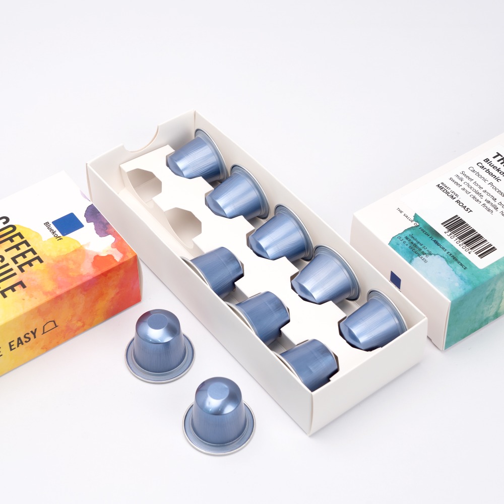บลูคอฟเลือกใช้บรรจุภัณฑ์แคปซูล ที่ทำจากวัสดุอะลูมิเนียมมาใช้ในการบรรจุผงกาแฟบด เนื่องจากมีน้ำหนักเบา แข็งแรงและทนทานต่อความร้อนและแรงดันของเครื่องชงกาแฟแคปซูล นอกจากนี้ยังสามารถนำแคปซูลที่ผ่านการสกัดกาแฟแล้วไปรีไซเคิลได้อีกด้วย