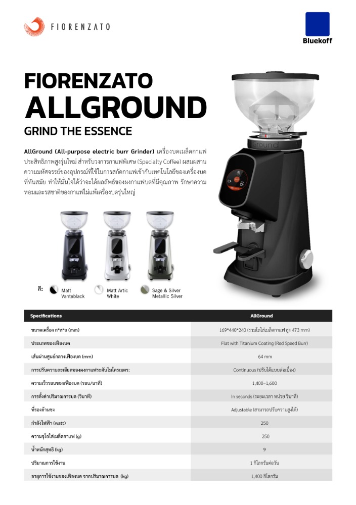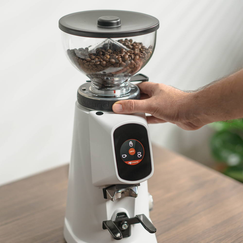 AllGround (All-purpose electric burr Grinder) เครื่องบดเมล็ดกาแฟประสิทธิภาพสูงรุ่นใหม่ สำหรับวงการกาแฟพิเศษ (Specialty Coffee) ผสมผสานความมหัศจรรย์ของรูปแบบการสกัดกาแฟเข้ากับเทคโนโลยีของเครื่องบดที่ทันสมัย ทำให้มั่นใจได้ว่าจะได้ผลลัพธ์ของผงกาแฟบดที่มีคุณภาพ รักษาความหอมและรสชาติของกาแฟด้วยการบดที่ออกแบบมาโดยเฉพาะ สำหรับการสกัดแบบเอสเพรสโซ Moka Pot และอุปกรณ์ฟิลเตอร์ทุกรูปแบบ