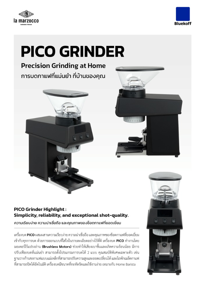 เครื่องบด Pico ผสมผสานความเรียบง่าย ความน่าเชื่อถือ และคุณภาพของช็อตกาแฟที่ยอดเยี่ยมเข้ากับทุกการบด ด้วยการออกแบบที่ใส่ใจในรายละเอียดอย่างไร้ที่ติ เครื่องบด Pico ทำงานโดยมอเตอร์ไร้แปรงถ่าน (Brushless Motors) ช่วยทำให้เสียงเบาขึ้นและเกิดความร้อนน้อย มีการปรับเฟืองบดที่แม่นยำ สามารถตั้งโปรแกรมการบดได้ 2 แบบ คุณสมบัติพิเศษเฉพาะตัว เช่น ฐานวางก้านชงกาแฟแบบแม่เหล็กที่สามารถปรับความสูงและถอดเปลี่ยนได้ และโถพักเมล็ดกาแฟที่สามารถปิดได้อัตโนมัติ บวกกับขนาดที่กะทัดรัดและใช้งานง่าย ทำให้เครื่องบด Pico เป็นเครื่องบดที่สมบูรณ์แบบสำหรับ home barista