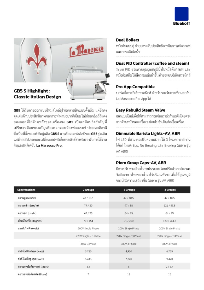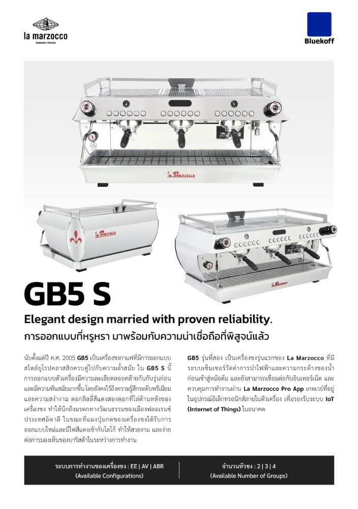 GB5 รุ่นใหม่ (รุ่นสอง) ได้รับการออกแบบใหม่สไตล์ยุโรปคลาสสิกแบบดั้งเดิม แต่ยังคงจุดเด่นด้านประสิทธิภาพของการทำงานอย่างดีเยี่ยม โลโก้ดอกลิลลี่สีแดงสองดอกที่โล่ด้านหลังของเครื่องชง GB5 เป็นเสมือนสิ่งสำคัญที่เปรียบเหมือนของขวัญหรือมรดกของเมืองฟลอเรนซ์ ประเทศอิตาลี ซึ่งเป็นที่ตั้งของบริษัทผู้ผลิต GB5 S มาพร้อมเทคโนโลยีของ GB5 รุ่นเดิมแต่มีการอัพเกรดและเปลี่ยนบอร์ดอิเล็กทรอนิกส์สำหรับรองรับการใช้งานกับแอปพลิเคชัน La Marzocco Pro.