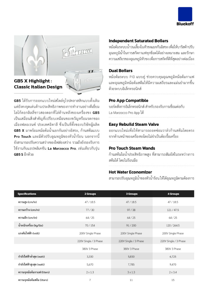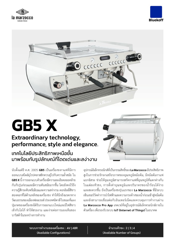 GB5 X ได้รับการออกแบบตามสไตล์ยุโรปดั้งเดิม ด้วยความสวยงามแบบคลาสสิก แต่ยังคงจุดเด่นด้านประสิทธิภาพของการทำงานอย่างดีเยี่ยม และมีรูปลักษณ์ที่โดดเด่น ด้วยโลโก้ดอกลิลลี่สีขาวที่เป็นสัญลักษณ์ของเมืองฟลอเรนซ์ เสริมความทันสมัยด้วยอุปกรณ์อิเล็กทรอนิกส์กรรมสิทธิ์ของ La Marzocco ที่มีประสิทธิภาพสูงในการช่วยรักษาเสถียรภาพของอุณหภูมิหม้อต้ม, มีหม้อต้มกาแฟแยกอิสระ ช่วยให้อุณหภูมิสามารถสกัดกาแฟที่อุณหภูมิที่แตกต่างกันในแต่ละหัวชง, การตั้งค่าอุณหภูมิและปริมาตรของน้ำร้อนได้ง่ายและสะดวกขึ้น GB5 รุ่นที่สอง เป็นเครื่องชงรุ่นแรกของ La Marzocco ที่มีระบบเซ็นเซอร์วัดค่าการนำไฟฟ้าและความกระด้างของน้ำก่อนเข้าสู่หม้อต้ม และยังสามารถเชื่อมต่อกับอินเทอร์เน็ตและควบคุมการทำงานผ่าน La Marzocco Pro App เกตเวย์ที่อยู่ในอุปกรณ์อิเล็กทรอนิกส์ภายในตัวเครื่อง เพื่อรองรับระบบ IoT (Internet of Things) ในอนาคต