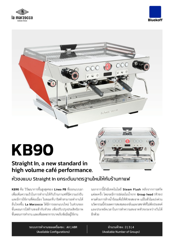 KB90 คือ วิวัฒนาการขั้นสูงสุดของ Linea PB ที่ออกแบบมาเพื่อเพิ่มความเร็วในการทำงานให้กับร้านกาแฟที่มีความเร่งรีบและมีการใช้งานที่ต่อเนื่อง ในขณะที่บาริสต้าสามารถทำงานได้ลื่นไหลขึ้น La Marzocco ได้มีการออกแบบใหม่ ในส่วนของขั้นตอนการใส่ก้านชงเข้ากับหัวชง เพื่อปรับปรุงประสิทธิภาพขั้นตอนการทำงาน และเพื่อลดอาการบาดเจ็บข้อมือผู้ใช้งานนอกจากนี้ยังมีเทคโนโลยี Steam Flush หลังจากการสกัดแต่ละครั้ง โดยจะมีการปล่อยไอน้ำจาก Group head (หัวชง) ตามด้วยการล้างน้ำร้อนเพื่อให้หัวชงสะอาด แม้ในชั่วโมงเร่งด่วน นวัตกรรมนี้ช่วยลดการสะสมของกลิ่นและรสชาติที่ไม่พึงประสงค์และประหยัดเวลาในการทำความสะอาดหัวชงระหว่างวันได้อีกด้วย