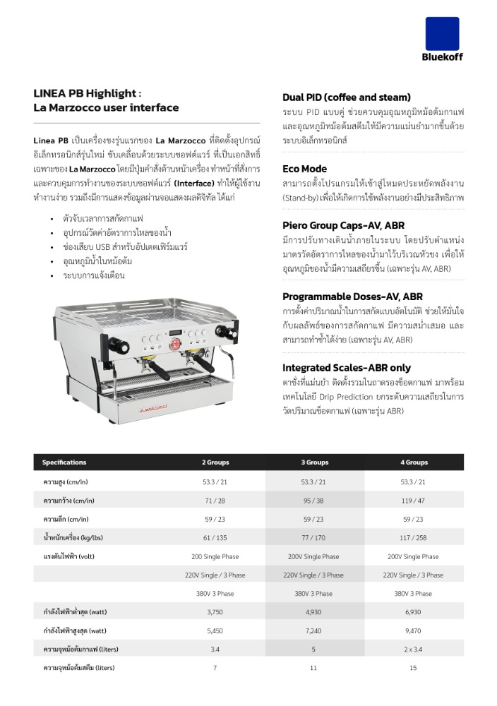 Linea PB เป็นเครื่องชงรุ่นแรกของ La Marzocco ที่ติดตั้งอุปกรณ์อิเล็กทรอนิกส์รุ่นใหม่ ขับเคลื่อนด้วยระบบซอฟต์แวร์ ที่เป็นเอกสิทธิ์เฉพาะของ La Marzocco โดยมีปุ่มคำสั่งด้านหน้าเครื่อง ทำหน้าที่สั่งการและควบคุมการทำงานของระบบซอฟต์แวร์ (Interface) ทำให้ผู้ใช้งานทำงานง่าย รวมถึงมีการแสดงข้อมูลผ่านจอแสดงผลดิจิตอล ได้แก่ ตัวจับเวลาการสกัดกาแฟ, อุณหภูมิน้ำในหม้อต้ม และระบบการแจ้งเตือน เป็นต้น