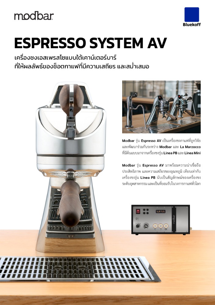 Modbar รุ่น Espresso AV เป็นเครื่องชงกาแฟที่ถูกวิจัยและพัฒนาร่วมกันระหว่าง Modbar และ La Marzocco ที่มีต้นแบบมาจากเครื่องชงรุ่น Linea PB และ Linea Mini