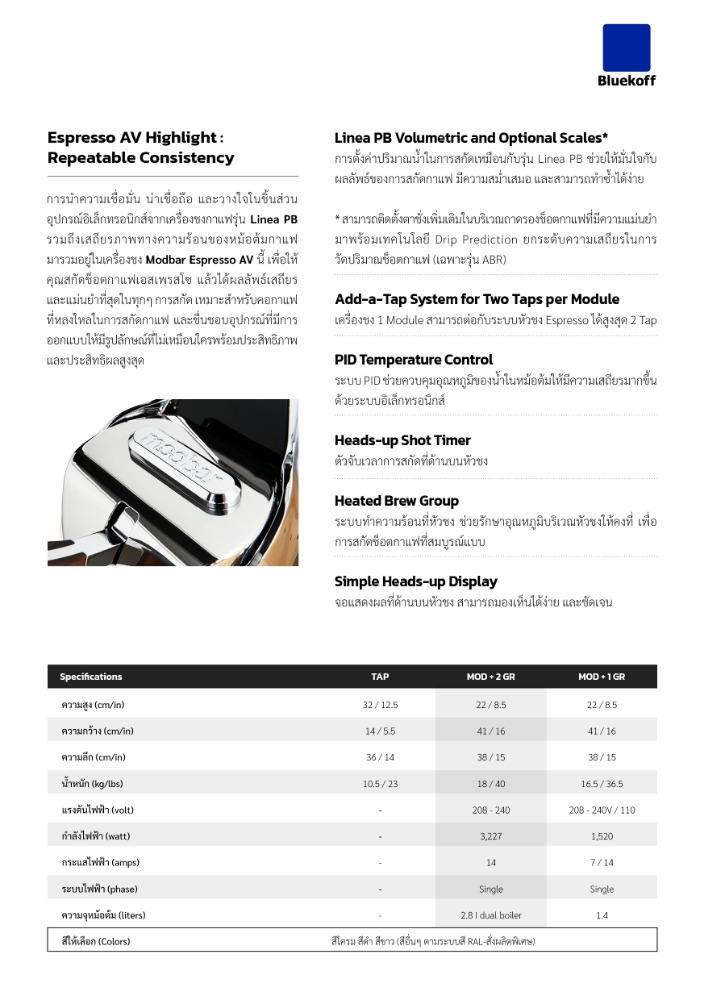 Modbar รุ่น Espresso AV มาพร้อมความน่าเชื่อถือ ประสิทธิภาพและความเสถียรของอุณหภูมิ เทียบเท่ากับเครื่องชงรุ่น Linea PB นับเป็นสัญลักษณ์ของเครื่องชงระดับอุตสาหกรรม และเป็นที่ยอมรับในวงการกาแฟทั่วโลก