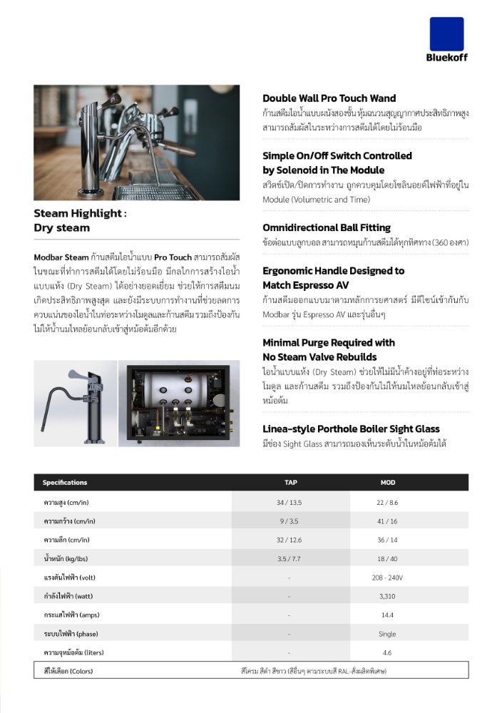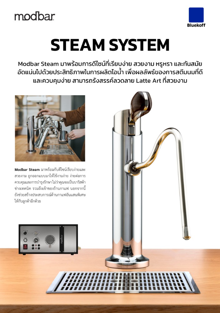 ก้านสตีมออกแบบมาตามหลักการยศาสตร์ มีดีไซน์เข้ากันกับ Modbar รุ่น Espresso AV และรุ่นอื่นๆ
