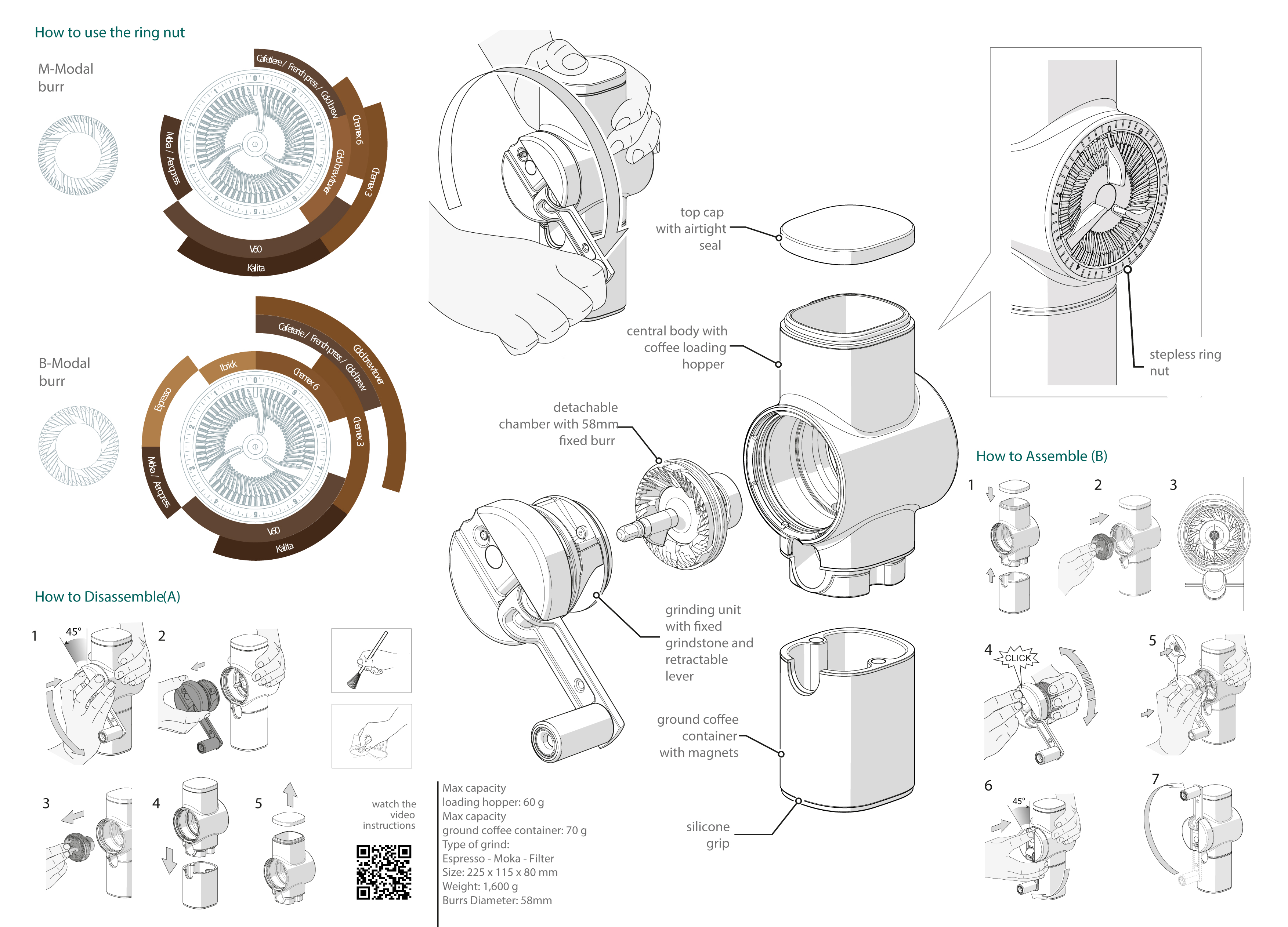 การออกแบบที่เรียบง่ายและสวยงาม เหมาะกับผู้ใช้งานหลากหลายสไตล์ สามารถบดเมล็ดกาแฟ เพื่อนำไปสกัดกาแฟแบบ Espresso และ แบบ Filter มาในขนาดที่กะทัดรัดหมุนพับเก็บได้ทำให้ง่ายต่อการพกพา